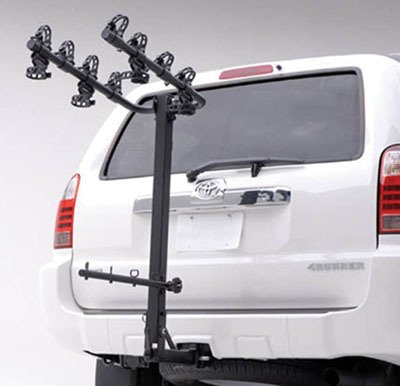 - Lower brace prevents bike from swaying Rack tilts for cargo area access Arms fold down when not in use